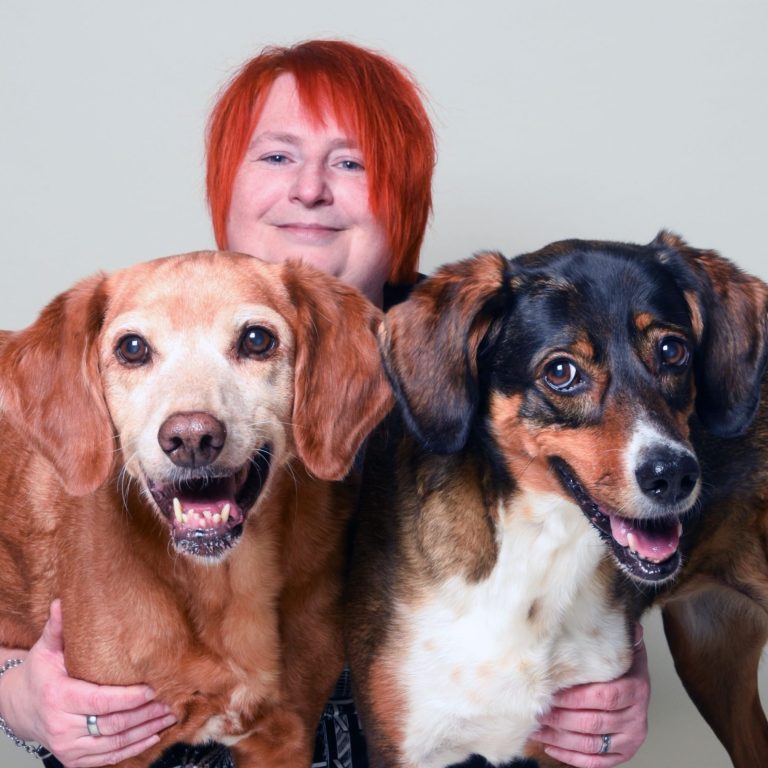 Das bin ich mit unseren Hunden Enny und Jack und wir drei wohnen zusammen mit meinem Ehemann in Landsweiler-Reden in der Gemeinde Schiffweiler.